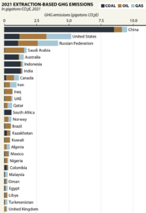 The graph below presents national greenhouse gas (GHG) emissions in a somewhat unusual way. Most commonly, national GHG emissions are attributed to the country where the fossil fuels are burnt. The graph below shows where they were produced in 2021. I’m sure you don’t need me to help you analyse it.