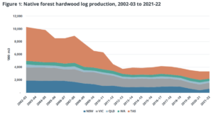 The tragedy of this for Australia is that state governments continue to authorise the destruction of native forests and their ecosystems even though the industry is rapidly declining ( graph below).
