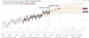 - the grey and then black zig zag line shows for each month from January 1971 to September 2023, the average amount of warming compared with the average temperature for 1850-1900, and