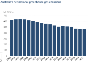 In fairness, Australia’s net emissions (graph above) decreased by 27% between 2007 and 2022 (1.6% per year), although they’ve been in the doldrums since 2016. Our best period was 2007-2016 when emissions decreased by 20% (2.25% per year). In general, our emissions are heading in the right direction but still well below the speed that is required to halt global warming below 1.5oC.