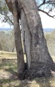 Among the many aspects of Wiradjuri life and culture that Uncle James pointed out to us were a boundary tree of the Wiradjuri land (the top photo shows the hole in the tree’s structure formed by two trunks spontaneously grafting together) and the scar formed after the bark was removed from a White Box tree (birri in Wiradjuri language) to make a canoe (muriin).