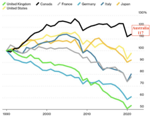 Bloomberg Green produced the graph below in a newsletter on 21 September 2023 – I can’t find it online, sorry. It shows the percentage change in greenhouse gas emissions for seven wealthy industrialised nations between 1990 and 2022.