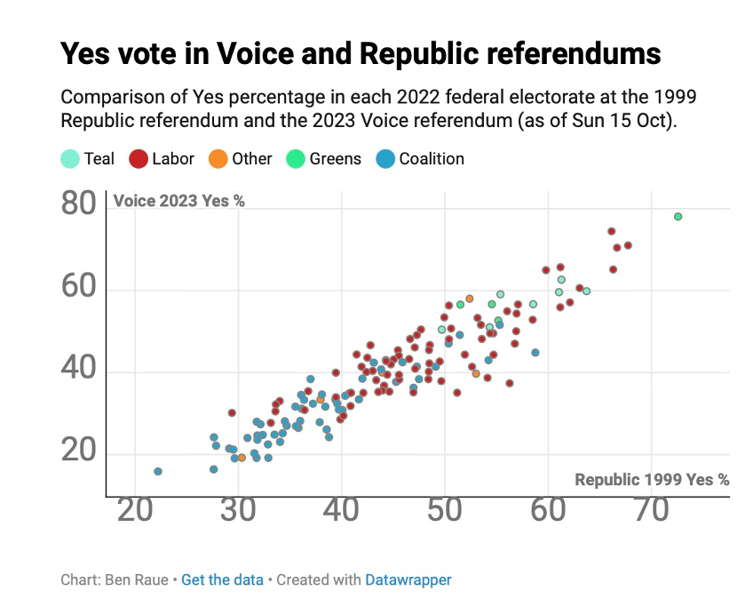 There were earlier hints of what was to come in the 1999 Republic Referendum. In both Referendums the strongest NO votes were in coalition seats and the strongest YES votes in seats now held by Labor, the Greens or the Teal Independents. In this sense the movement of voters in the wealthier, and better educated, seats to support progressive issues is not new - it has been going on for close to quarter of a century. Although the overall Yes vote for the Voice was lower than for the Republic there is quite a tight correlation between how electorates voted in the two referendums: