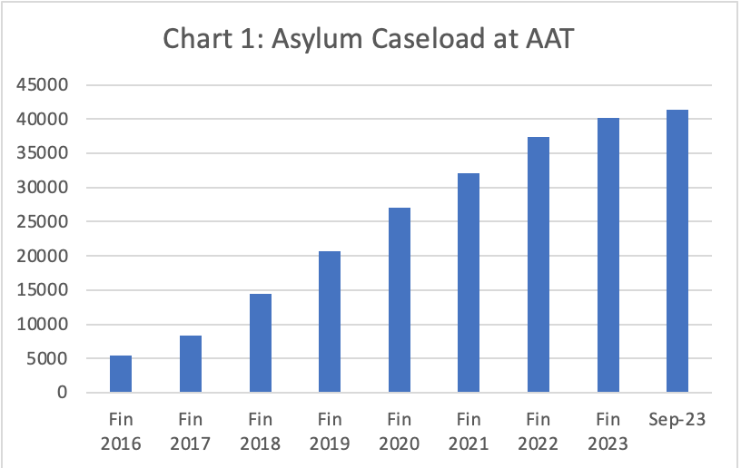 At end September 2023, the asylum backlog at the AAT had reached an astonishing 41,374, having grown from 5,434 at end June 2016 (see Chart 1).