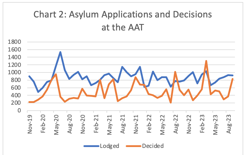 The backlog has grown rapidly as the number of decisions the AAT has been able to make is generally well below the rate of new applications (see Chart 2).