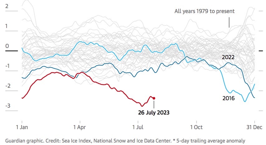 The extent of sea ice around Antarctica (Figure 2) this past year dropped dramatically below previous extents. 2016 and 2020 were on the low side, but still within or near previous extents. This year they have dropped away into unknown territory, and in the southern winter.