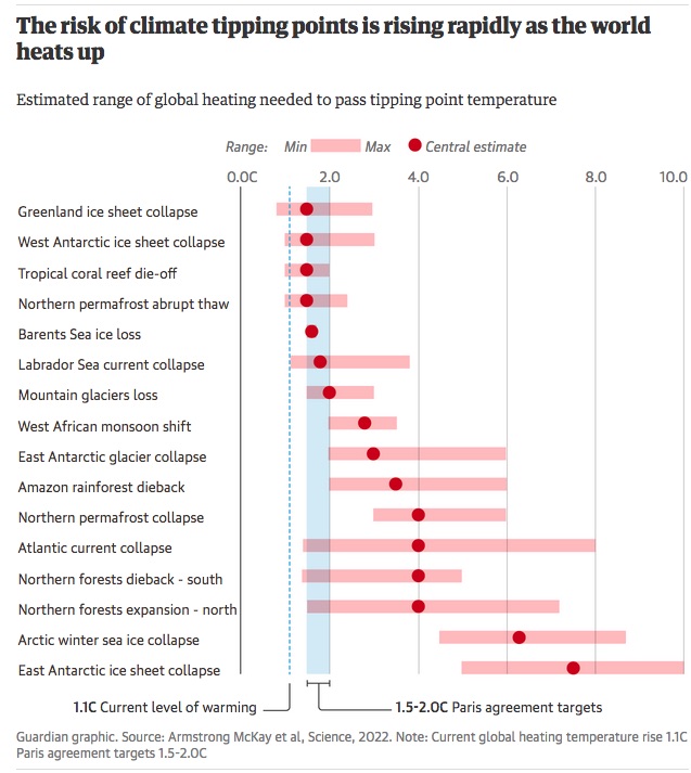 You will notice there is a pink band of uncertainty around each red dot. Perhaps those systems won’t tip until 2-3°C of warming. Or perhaps they are already tipping. We don’t know.