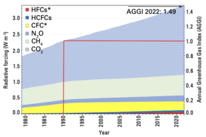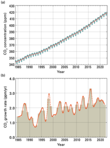 The World Meteorological Organization’s November 2023 Greenhouse Gas Bulletin confirms what anyone who’s been paying attention knows: ever more greenhouse gases (GHGs) are being pumped into the atmosphere, the concentration of GHGs in the atmosphere continues to increase and the rate of increasing concentration in absolute terms (parts per million per year) is more rapid now than 30 years ago (first three graphs below). None of this is surprising but it does dispel any hope that although things may be getting worse, at least it’s more slowly now.