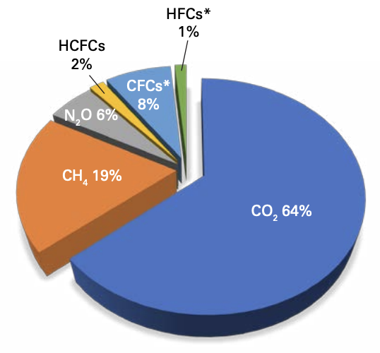 The final graph displays the relative contributions in 2022 of the various GHGs to global warming since the pre-industrial era. CO2 has contributed almost two-thirds and methane almost a fifth. Most of the anthropogenic CO2 comes from fossil fuels but most of the anthropogenic methane comes from agriculture. The various (relatively modern) fluorocarbons, that have very strong global warming effects, have now contributed over 10%.