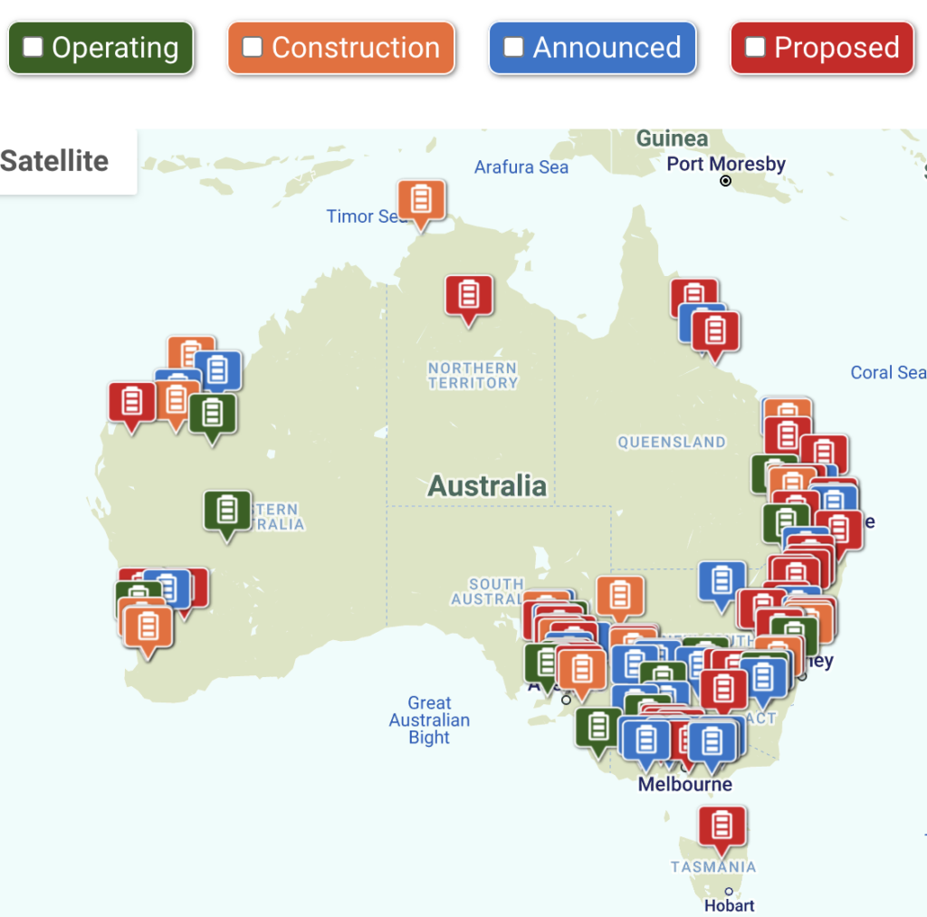 We may not hear much about them but there are 17 big batteries already operating in Australia. A further 17 are currently under construction and about 60 more have been announced or are proposed. The map below (interactive in the link) shows their location. There are also maps for solar farms, wind farms, offshore wind projects and pumped hydro projects.