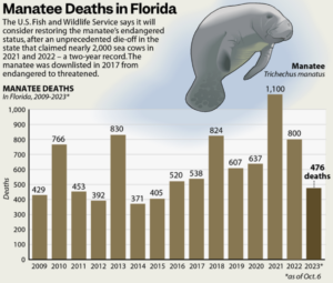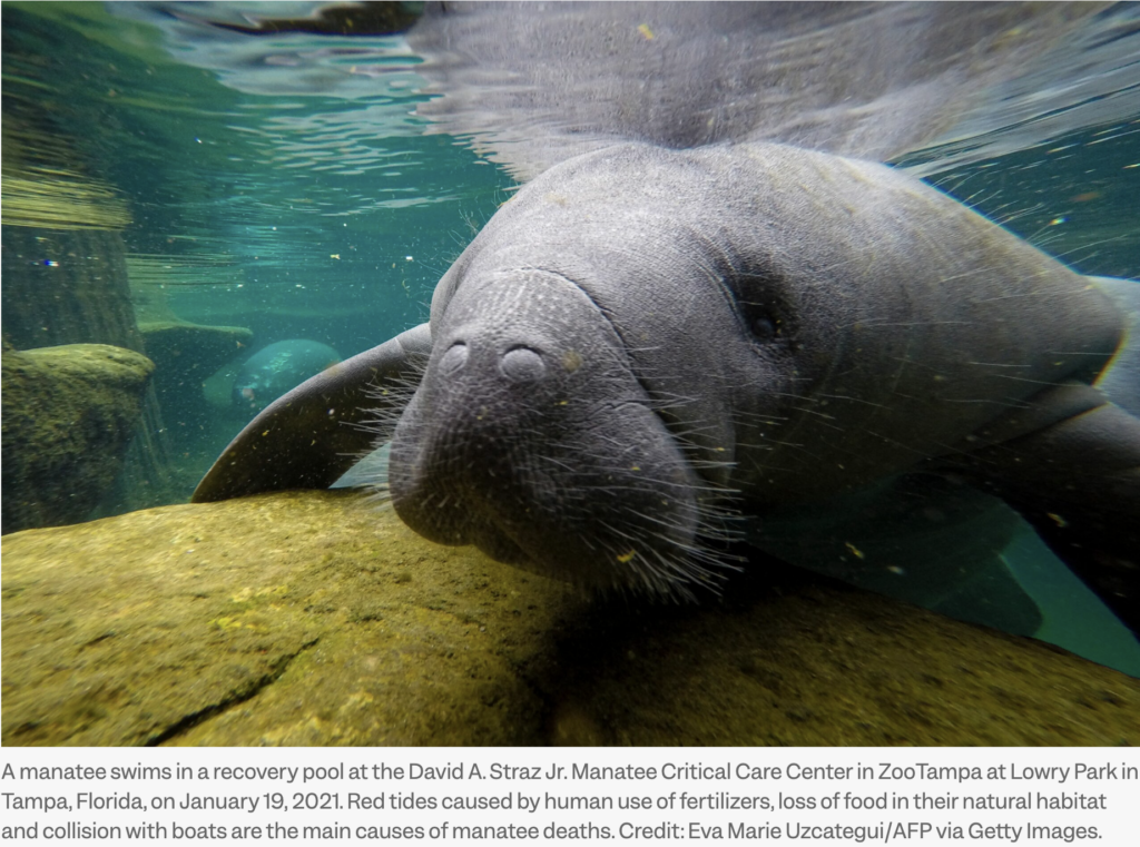 Nearly 2,000 manatees died in Florida during 2021 and 2022 – about 20% of the local population. This followed a downgrading in 2017 of the species from endangered to threatened despite opposition from experts and conservation groups. Loss and degradation of the manatees’ habitat and boat strikes are the main problems but the transition to renewable energy is also likely to cause a problem – not because of global warming but local ocean cooling. About 60% of the population is dependent on the artificially warm water found around coal-fired power stations where the manatees gather in winter.