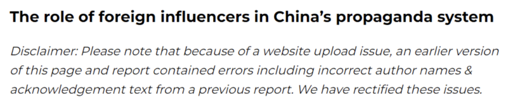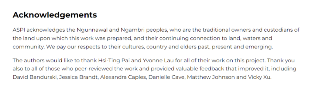 But it doesn’t stop there, every time ASPI releases a report, Australian media leaps in to amplify it. An example was the Sydney Morning Herald which made several errors and was contacted by one of the named people in ASPI’s report with corrections.