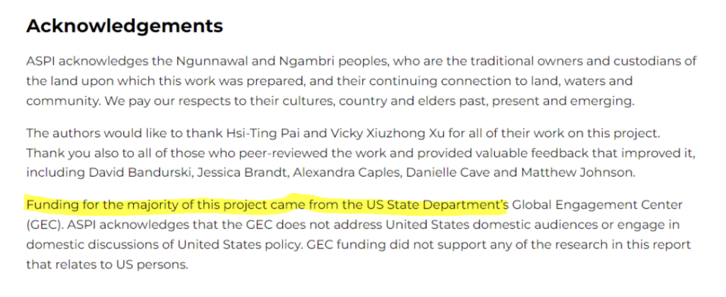ASPI discloses they receive US funding in their annual report. It’s a lot of money but despite being paid so much, they couldn’t find the time to have the authors watch some videos, find any lies then write a truthful report. Until they do that, whatever they write is exactly what they accuse others of doing, state funded propaganda and, unless they can demonstrate there are lies in the videos they watch, then their report serves no purpose other than to misinform.