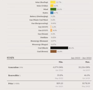 According to OpenNEM, increasing contributions from mostly small-scale solar, wind and large-scale solar supplied combined to supply an average share of 38.4 per cent renewables across the country’s main grids for the year, from January 2023 to January 2024 (inclusive).