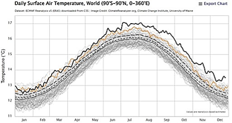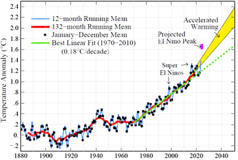 December was the 7th consecutive month of record-shattering global temperature, driven by the combination of a moderately strong El Nino and a large decrease of Earth’s albedo. By May the 12-month running-mean global temperature relative to 1880-1920 should be +1.6-1.7°C. It will be clear that the 1.5°C ceiling has been passed for all practical purposes (Figures 1 and 2).