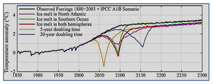Figure 3. Future model transient cooling periods consequent on flow of ice melt water from Greenland and Antarctica into the oceans ( Hansen at al., 2016)