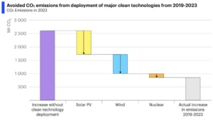 Between 2019 and 2023, global energy-related emissions of CO2 increased by 900 million tonnes (Mt) to reach 37.4 billion tonnes (Gt). However, according to the International Energy Agency, without clean energy from solar (900 Mt), wind (700 Mt) and nuclear (100 Mt) the increase in CO2 emissions would have been three times larger (the IEA considers nuclear to be ‘clean’).