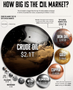 The current oil market is enormous. Only by comparing it to other large resource markets can its size be fully appreciated. For instance, it is more than twice as large in dollar value as the top ten metal markets combined. Australia is undoubtedly the world’s major producer of iron ore but the income it produces pales somewhat compared with, say, the USA’s income from oil.