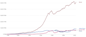 There’s a tendency to think of oil as the fuel of the 20th century. However, despite its role in the cause and outcome of World War II, oil production globally (measured in the graph below in terawatt-hours) only really took off around the middle of the century. Indeed, it was a crucial driver and indicator of The Great Acceleration.