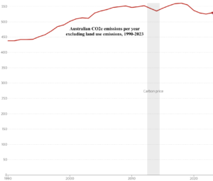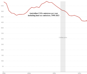 Australia’s total domestic emissions (currently 460 million tons CO2e per year) have been slowly decreasing since about 2008 when they were about 650 mt/year - roughly the same as they had been in 1990. That’s a 30% reduction - not bad, you might think.