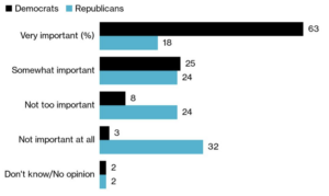 The bar chart below (from Bloomberg Green Daily newsletter, 29.2.24) shows the response of 5,000 voters in the swing-states of Arizona(B), Georgia(B), Michigan(B), Nevada(B), N Carolina(T), Pennsylvania(B) and Wisconsin(B) to the question: ‘How important, if at all, is climate change when deciding who to vote for in the November 2024 election for U.S. president?’.