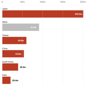 The second issue I’ll draw your attention to concerns Australia’s exported GHG emissions – i.e, the emissions released when the coal and gas (and a little oil) that we dig up and ship out are burnt overseas. These add up to about 1,100 mt/year, well over twice our domestic emissions. Our best customer by far for gas (LNG) and for metallurgical and thermal coal is Japan, illustrated below with the emissions from thermal coal (million tons of CO2e) in 2022/23.