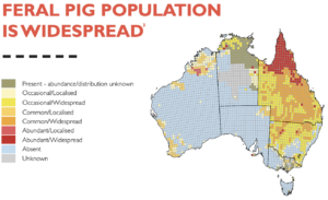 The map below demonstrates that feral pig numbers are greatest in Cape York but they are present throughout Queensland and in many areas of NSW and the Northern Territory.