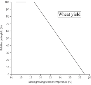 Nor is it only animals that are affected by heat. Single events of extreme heat can, of course, devastate crops but prolonged heat stress is also harmful. In a field experiment involving irrigation and artificial heating, the wheat yield decreased steadily once the average temperature of the growing season exceeded 18oC, with complete crop failure at 29oC.