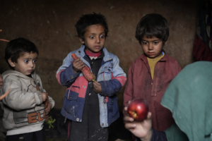 ‘Children stare at an apple that their mother brought home after begging, in a camp for internally displaced people in Bagrami, on the outskirts of Kabul.’