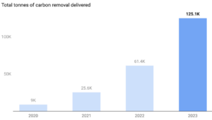 The tonnage of CO2 removal purchased by companies to offset their own emissions is increasing rapidly and reached 4.5 million tonnes (Mt). The big increase between 2022 and 2023 was mainly due to Microsoft purchasing 2.67 Mt to be delivered over 11 years from Ørsted who will use Bioenergy with Carbon Capture and Storage (BECCS) to do the work.