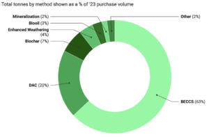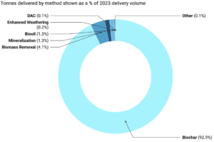 When we look at the method that removed most (of the not very much) CO2 removed in 2023, there is only one horse in the race: Biochar at 93%.