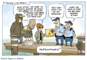 Macintosh and two colleagues published a scathing, non-technical version of their paper in a recent edition of The Saturday Paper, while cartoonist David Pope lampooned offsets with reference to net zero murders: