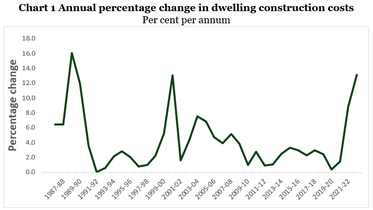 The ABS price index for the cost of constructing and altering dwellings has increased very rapidly in the last two years by 8.8% in 2021-22 and 13.1% in 2022-23. However, as can be seen from Chart 1 below dwelling construction costs have a track record of exceptionally rapid increases in economic booms when inflation is high, with increases as high as 16% in 1988-89 and 12% in 1989-90, and again 13% in 2000-01.