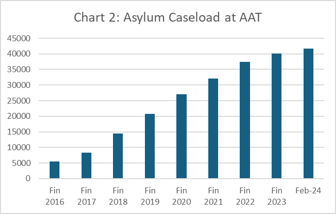 Total undecided asylum applications at the AAT hit a new record of 41,648 (see Chart 2). Even with the additional funds allocated to the AAT to process its asylum backlog more quickly, the faster processing at the primary stage is likely to new asylum applications to the AAT will remain high and the backlog at the AAT will continue to grow for much of 2024.