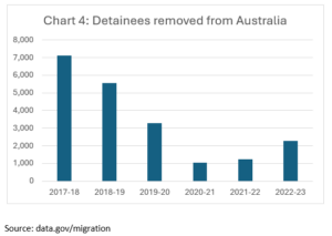 But this was not associated with an increase in the number of people in detention being removed from Australia. That actually fell steadily (see Chart 4).