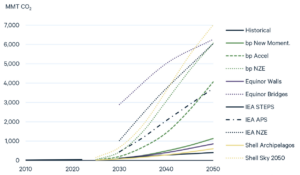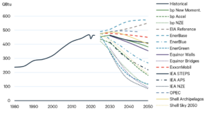 Notwithstanding the problems, it’s my observation that when different people who know what they are talking about (this is the crucial factor) make projections about the same thing, there is usually a reasonable degree of agreement amongst them. But not always, as illustrated by four of the comparisons by Global Energy Outlook of scenario-based projections made by a range of agencies about the world’s energy future to 2050