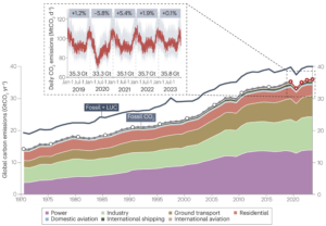 Worldwide emissions of CO2 increased slightly in 2023, principally as a result of continuing long-term increases from electricity generation, industry and land transport (the sectors that are also the largest emitters).