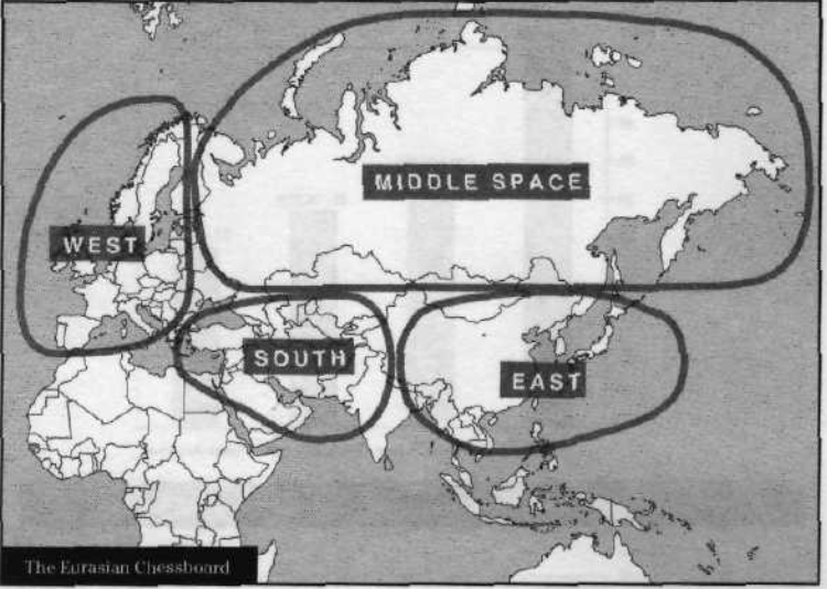 For the USA to achieve world domination, Brzezinski advocated the expansion of the EU and NATO into the area of the former Warsaw Pact and beyond into central Asia, flipping these countries, and bringing them into an anti-Russian alliance. An accompanying map in The Grand Chessboard shows the Eurasian section of the world island with a large area which is called the middle space, which is Russia, which is described as ‘the black hole of Eurasia’. Brzezinski’s strategy is for NATO to push into this middle space. According to Brzezinski, this strategy was not driven by hostility towards Russia, nor by fear of Russia, nor by any desire to isolate Russia, but as the key to Brzezinski’s strategy is for NATO to absorb Ukraine and to push into the black hole of Eurasia, it was obviously perceived by Russian geostrategists as an existential threat to the Russian state.