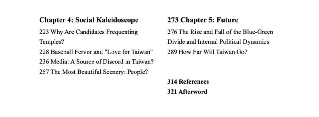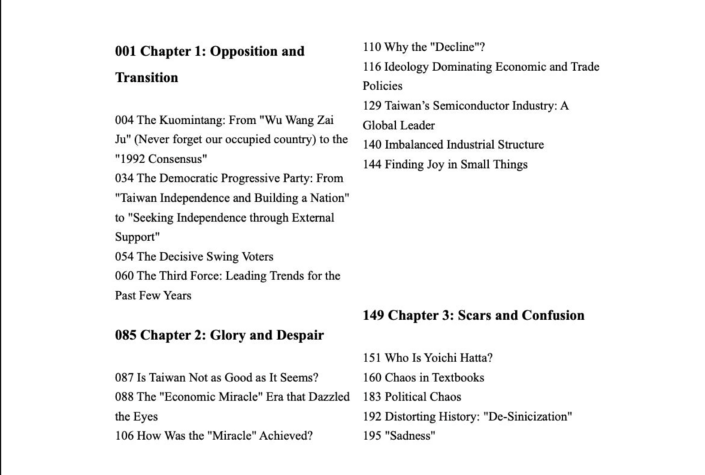 Wu has been involved in Taiwan-related news editing for nearly 15 years, with a cumulative 34 months posted in in Taiwan. He has witnessed and reported on nearly all significant news events in Taiwan since 2014. In 2023, he published the book 嬗****变与归途 深一度看台湾 “Transition and Reunification: A Deeper Look at Taiwan,” which offers insights into Taiwan’s politics, economy, society, culture, and history education, based on his observations over the years. The book outlines Taiwan’s historical development from the Japanese colonial period to the post-1945 era. Wu aims to clearly explain “how Taiwan has gradually become what it is today” and offer some predictions on “what Taiwan might become in the future.” The book is currently available in simplified Chinese and can be purchased online. I’ve translated the table of contents below.