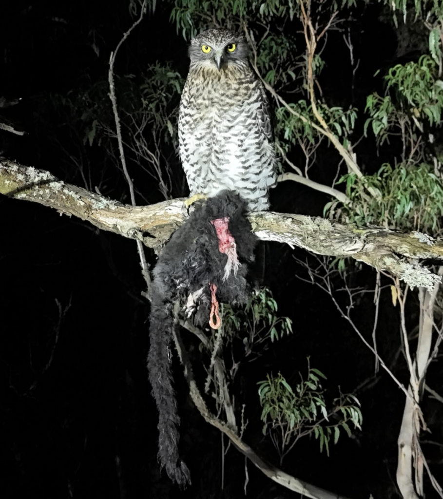 The photo below was taken during one of the night-time surveys in the Tallaganda. It shows a Powerful owl with a freshly killed Greater glider and demonstrates the value of identifying glider dens for the protection of both of these threatened species as well as our native trees.