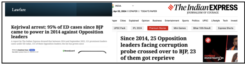 On 21 March, _The_ _Indian Express_ reported that between Modi becoming PM in 2014 and September 2022, 121 senior politicians had been investigated by the Enforcement Directorate, of whom 115 (95 percent) were from opposition parties. In the decade in which Modi has been PM, 25 opposition leaders facing corruption probe crossed over to BJP and 23 of them managed to get a reprieve, _The Indian Express_ reported on 3 April.