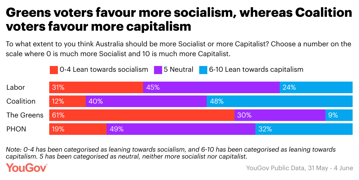 Comparatively, the Coalition voters were the only group of voters in favour of Australia being more capitalist, as expressed by 48%. 40% were neutral, with 12% more in favour of socialism, resulting in a net of +36% for capitalism.