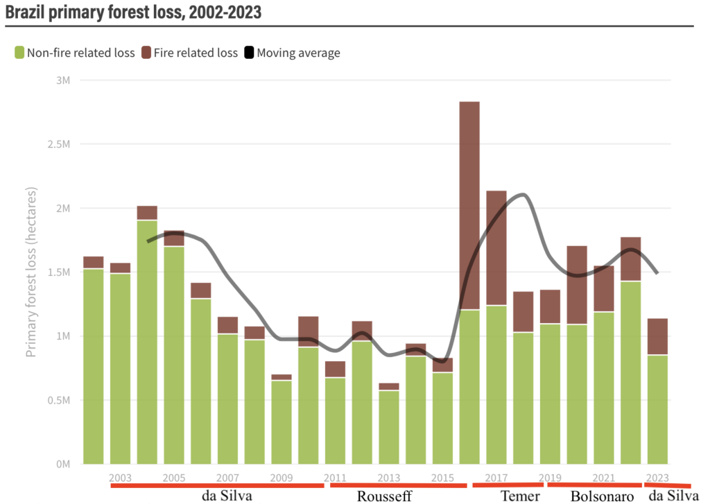 As Paul Keating famously said, ‘When you change the government, you change the country’. The pattern of forest lost in Brazil over the last 20 years seems to confirm Paul’s wisdom – see the histogram below to which I have added the periods in office of the various presidents.