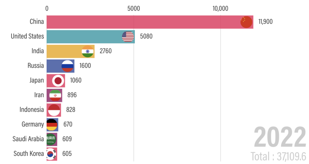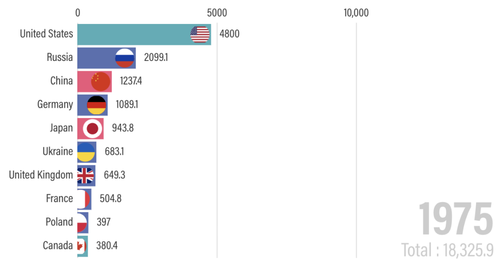 The next three graphs (snapshots from an animated sequence in the link) show for 1950, 1975 and 2022 the total CO2 emissions for that year and the emissions of each of the ten major emitting countries. The emergence of the USA, then China and more recently India as the major emitters reflects their industrialisation and growing economic heft.