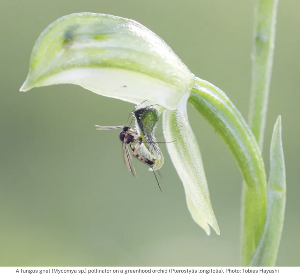 Australia is the main home of greenhood orchids, of which there are about 300 species globally. Greenhoods produce chemicals that resemble the sex pheromones of female fungus gnats. Male fungus gnats, doing what comes naturally, try to mate with the orchid but as they go deeper into the flower a door closes behind them (watch the video in this article). The only remaining way out forces them past the orchid’s sexual organs and they inadvertently collect or drop off some pollen. On the gnat goes to another flower and … well, you know the story from here.