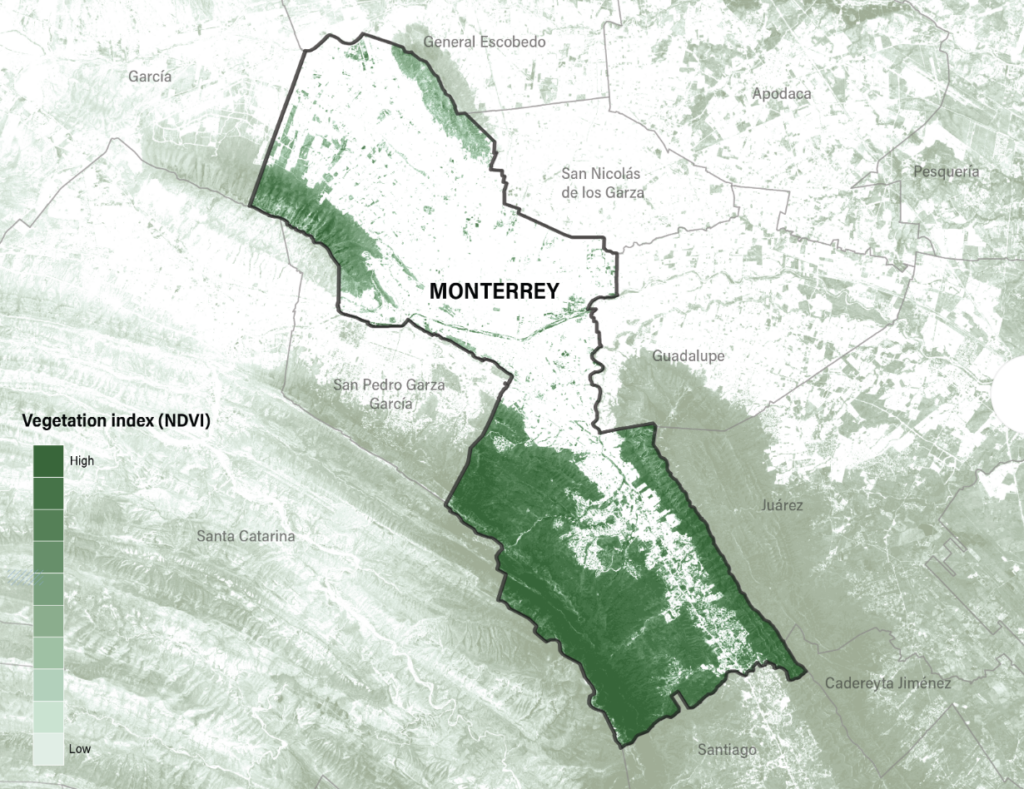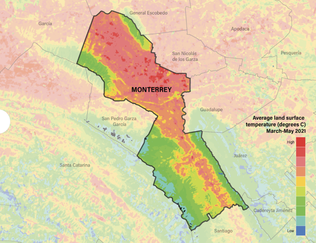 The two maps below show measures of vegetation cover (the greenish map) and average land surface temperature (pinkish map) for Monterrey, CA in March-May 2021. Across the whole municipality there was an 11oC temperature difference between the hottest and coolest districts, and across the mostly urban districts there was a difference of 6oC.