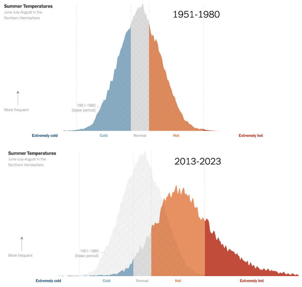 But to add a little clarity, the graphs display land temperatures across the whole northern hemisphere in June, July and August during 1951-1980 and 2013-2023. Because the graphs cover such a wide range of locations – pole to equator, coast to hundreds of kilometres inland, sea level to high altitudes – the horizontal axis relates to whether the temperatures are ‘cold’, ‘normal’ or ‘hot’ for each specific location.