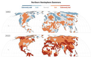 The next two maps show the temperatures over land in the northern hemisphere during June, July and August in 1963 and 2023. It’s glaringly obvious that almost everywhere north of the equator is now experiencing hotter summers, and it’s only going to get hotter.