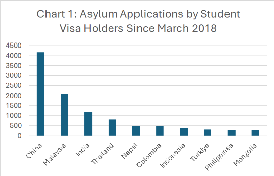 By far the largest student source nation providing asylum applications since March 2018 was China at 4,170, followed by Malaysia (2,099), India (1,193), Thailand (802), Pakistan (610), Nepal (496) and Colombia (482).