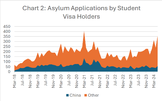 Students applying for asylum in 2018 averaged around 100 per month. This was a relatively small portion of total asylum applications in 2018 which averaged well over 2,000 per month. While overall asylum applications during covid fell with international borders closed, asylum applications from student visa holders actually increased during this period. This was particularly the case for students from China.